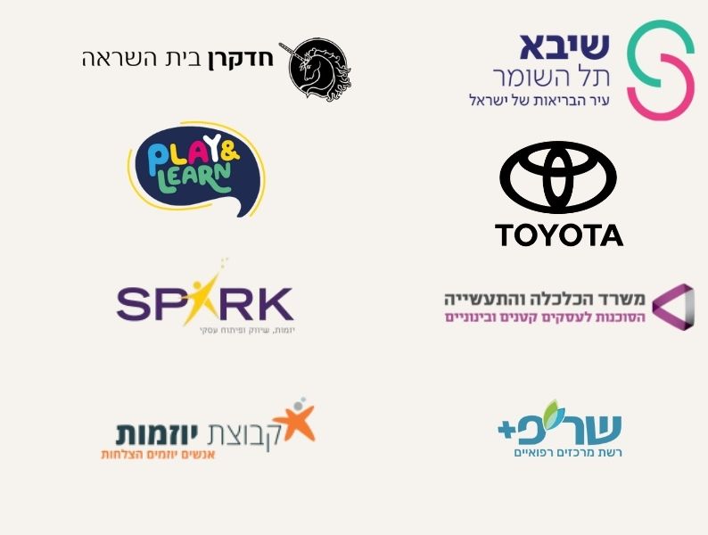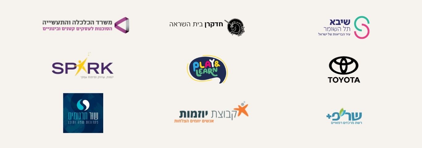 משרד הכלכלה והתעשייה - הסוכנות לעסקים קטנים ובינוניים, חדקרן בית השראה, שיבא תל השומר - עיר הבריאות של ישראל, SPARK יוזמה שיווק ופיתוח עסקי, Play and Learn, Toyota, שור תרגומים - פתרונות שפה ותוכן, קבוצת יוזמות - אנשים יוזמים הצלחות, שרפ+ רשת מרכזים רפואיים.