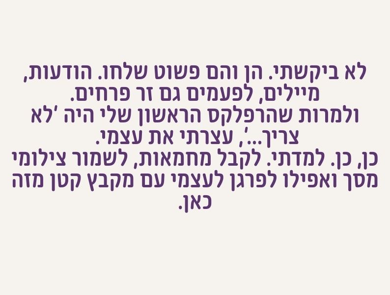 הודעות, מיילים, לפעמים גם זר פרחים. לא ביקשתי, הן והם פשוט שלחו. ולמרות שהרפלקס הראשון שלי היה "לא צריך... עצרתי את עצמי". כן, כן. למדתי לקבל מחמאות, לשמור צילומי מסך ואפילו לפרגן לעצמי עם מקבץ קטן מזה כאן.