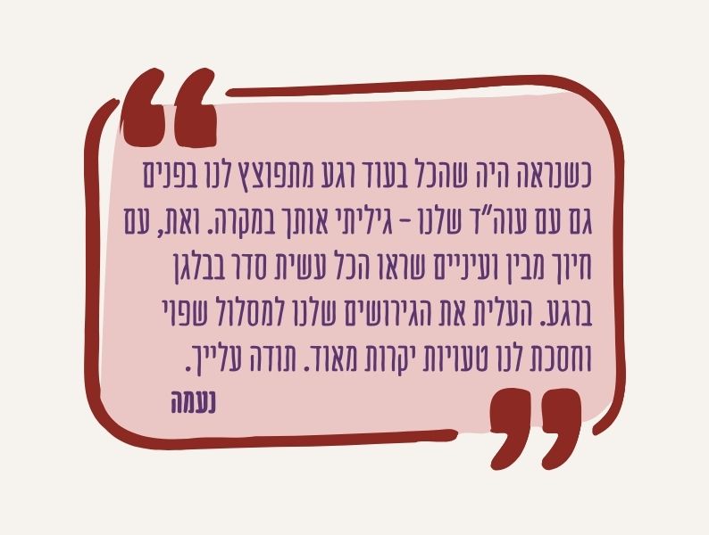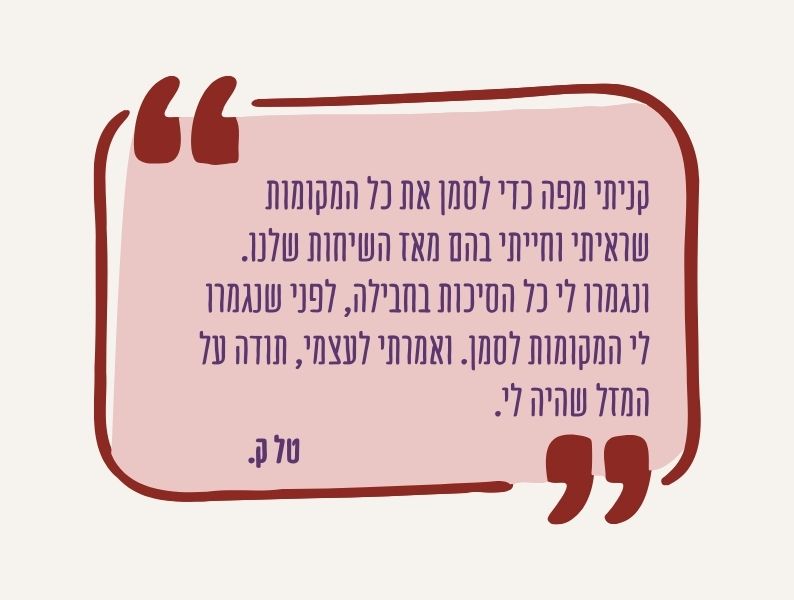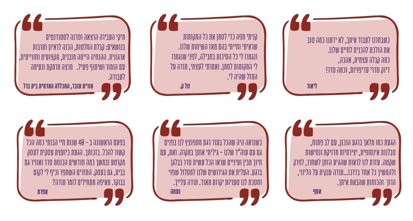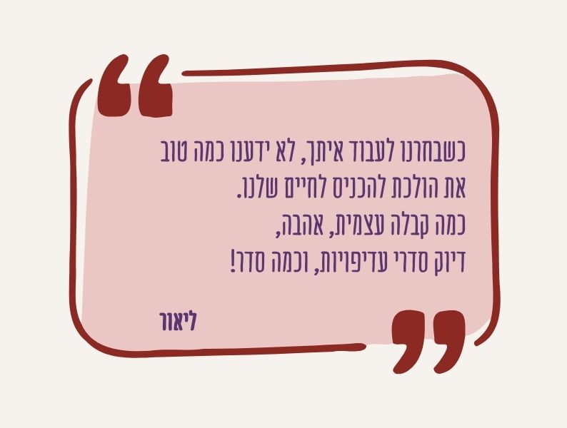 כשבחרנו לעבוד איתך, לא ידענו כמה טוב את הולכת להכניס לחיים שלנו. כמה קבלה עצמית, אהבה, דיוק סדר יעדיפויות, וכמה סדר!