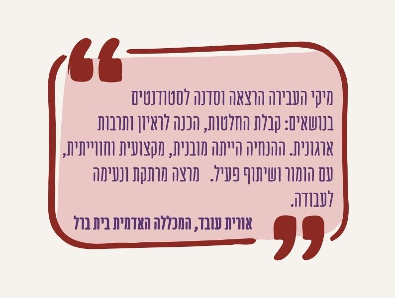 מיקי העבירה הרצאה וסדנה לסטודנטים בנושאים: קבלת החלטות, הכנה לראיון ותרבות ארגונית. ההנחיה הייתה מובנית, מקצועית וחווייתית, עם הומור ושיתוף פעיל. מרצה מרתקת ונעימה לעבודה.