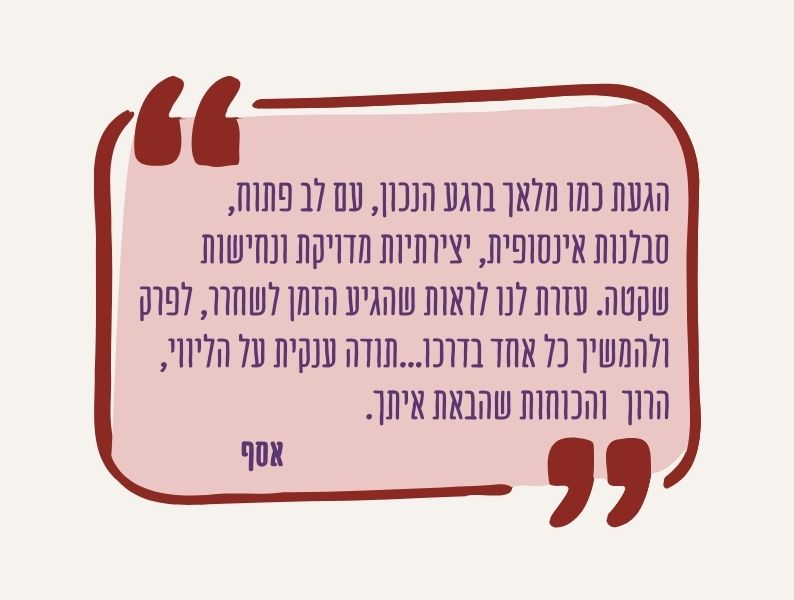 הגעת כמו מלאך ברגע הנכון, עם לב פתוח, יצירתיות מדויקת ונחישות סבלנות אינסופית, שקטה. עזרת לנו לראות שהגיע זמן לשחרר, לפרק, ולהמשיך כל אחד בדרכו... תודה ענקית על הליווי, הרוך והכוחות שהבאת איתך.