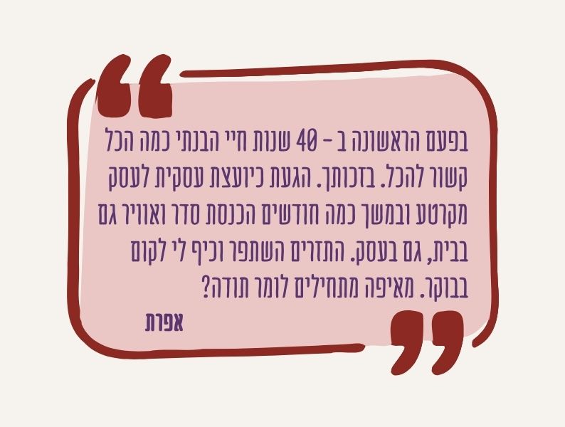בפעם הראשונה ב-40 שנות חיי הבנתי כמה הכל קשור להכל. בזכותך. הגעת כיועצת עסקית לעסק מקרטע ובמשך כמה חודשים הכנסת סדר ואוויר גם בבית, גם בעסק. התזרים השתפר וכיף לי לקום בבוקר. מאיפה מתחילים לומר תודה?