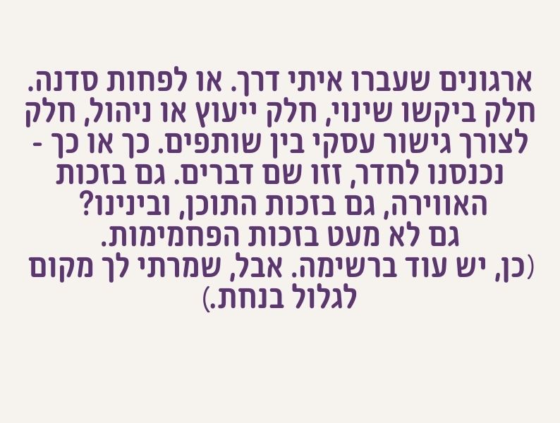 ארגונים שעברו איתי דרך. חלק ייעוץ או ניהול, חלק לצורך גישור עסקי או לפחות סדנה. חלק ביקשו שינוי בין שותפים. כך או כך - נכנסנו לחדר, זזו שם דברים. גם בזכות האווירה, גם בזכות התוכן, ובינינו? גם לא מעט בזכות הפחמימות.